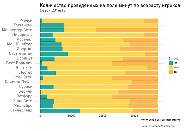 Стоит обратить внимание на показатель количества проведенных на поле минут по возрасту вместо того, чтобы просто считать игроков в каждой возрастной категории.