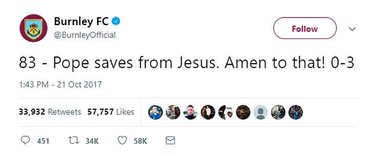 Твиттер «Бернли» обыграл фамилии вратаря Ника Поупа (Pope) и нападающего Габриэла Жезуса (Jesus). Pope – Папа Римский, Jesus – Иисус. «Папа (Римский) спасает после удара Иисуса. Аминь!» – написали в твиттере «Бернли». Правда, Папа не спас команду от поражения 0:3. Иисус и «Манчестер Сити» победили.