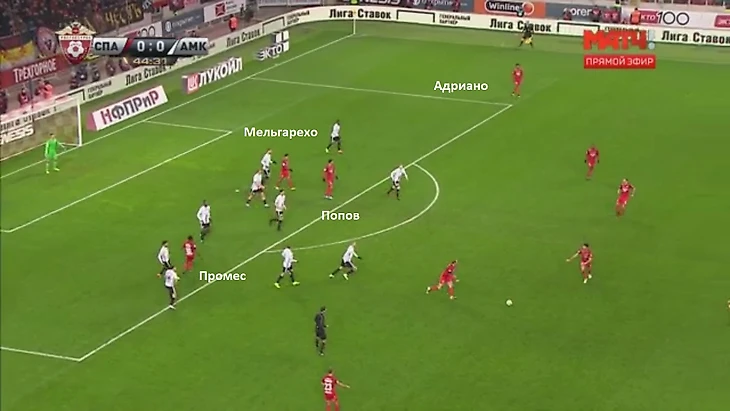 В первом тайме красно-белые использовали схему 4-4-2, где пару нападающих составляли Адриано и Мельгарехо. И если бразилец мог поменяться позициями с Поповым и уйти на фланг, но Мельгарехо перманентно был впереди! Да уругваец же отлично играет головой! Помните его выступления за «Кубань»? В первой половине сезоне-2015/16 парагваец трижды забил со второго этажа! Невысокий рост (178 сантиметров) для него не является помехой, так как в детстве он занимался легкой атлетикой (прыгал через планку) и обладает хорошим прыжком. Но ставка на него в качестве центрфорварда не оправдалась - в первом тайме он ни разу не пробил из штрафной, нанеся лишь два удара из-за ее пределов. А ведь «Спартак» совершил в первой половине матча сразу 18 подач в штрафную, во втором тайме - 17. Их равномерное распределение говорит об акценте на них.
