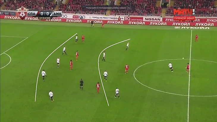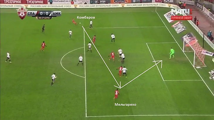 После выхода на поле Кутепова вместо Ещенко «Спартак» перешел на схему 3-4-3. Мельгарехо стал правым латералем. В стадии атаки иногда он менялся местами с правым инсайдом. Теперь он получил возможность врываться в штрафную на скорости - как с мячом, так и под передачи. Такая ставка имела правда на жизнь - во втором тайме парагваец нанес сразу шесть ударов! Пять из низ из штрафной, два - головой. После перерыва «Спартак» вообще прибавил, нанеся 15 ударов тогда как до перерыва 11.