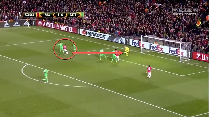 На примере выше, взятом из победного матча «Юнайтед» в Лиге Европы с «Сент-Этьеном», можно заметить способность Марсьяля создавать голевые возможности из ничего. Получив мяч глубоко на своей половине поля, он обходит на дриблинге двух соперников, перед тем как нанести решающий удар по воротам с девяти метров.