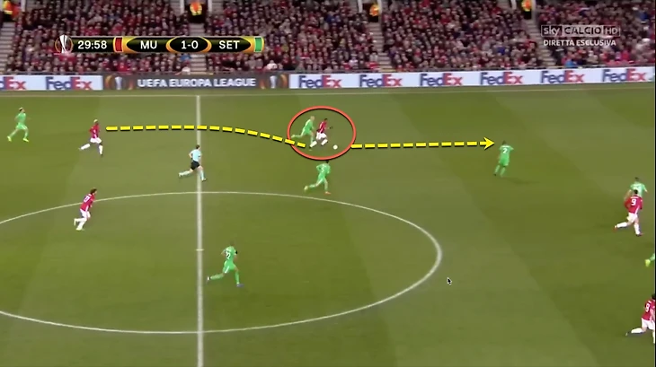 Выше, почувствовав возможность забить, Марсьяль смещается в центральную зону. Благодаря подобным движениям, появляется возможность для паса у игроков вроде Погба, Маты, Мхитаряна или даже Златана Ибрагимовича, который любит опускаться глубже, чтобы участвовать в комбинационной игре.