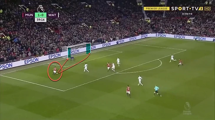 Предыдущие кадры демонстрируют хладнокровие Марсьяля перед воротами в матче против «Уотфорда». Ворвавшись в зону одиннадцатиметровой отметки, француз сообразил, что Эурелио Гомес занял отличную позицию. Чтобы забить в такой ситуации, нужно пробить предельно точно. Вместо того чтобы пытать счастья, Марсьяль спокойно подбирается поближе и выбирает более простое решение с ударом в ближний угол.