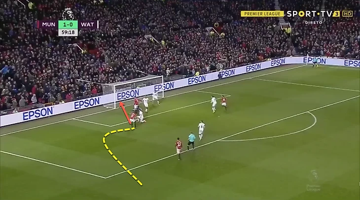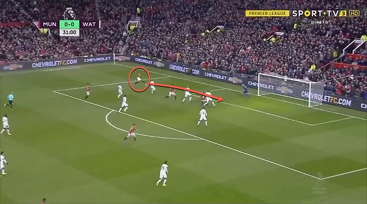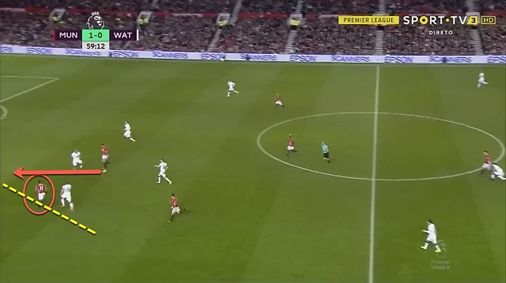 Выше можно отметить, как Марсьяль добавляет движения, откликаясь на передачу Мхитаряна, и создаёт гол для Маты в матче против «Уотфорда».