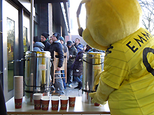 «Боруссия» предложила стоящим на холоде фанатам и желающим приобрести билеты бесплатно кофе и чай, а талисман пчелка ЭММА была на месте, всегда готова была сфотографироваться и помогала при угощении.