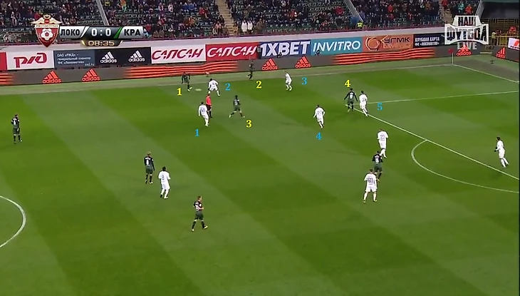 Если вы хотите играть широко, вам необходимо быстро переключать игру из зоны в зону, чтобы ловить соперника на отсутствии компактности. Вместо этого «Краснодар» долго разыгрывает мяч в середине, используя для этого, в частности, центральных защитников. В той же игре с «Локомотивом», от которой мы будем отталкиваться, «железнодорожники» играли плотным средним блоком, и спокойно смещались с фланга на фланг, не испытывая серьезных проблем.