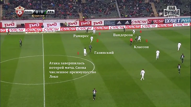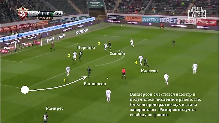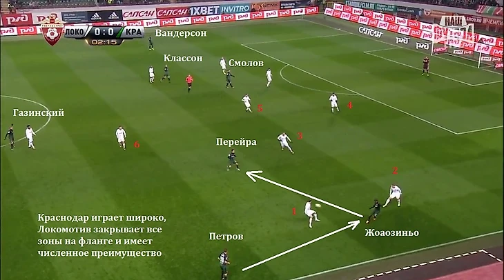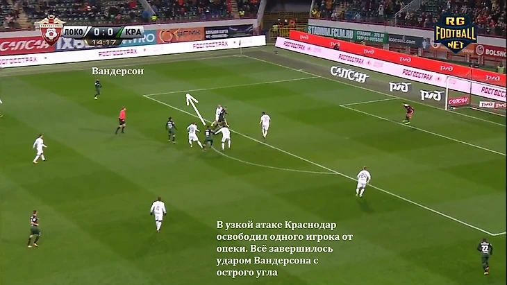 Узкое расположение игроков «Краснодара» привело к тому, что на фланге остался без опеки Вандерсон. Он спокойно смещается в штрафную и бьёт с острого угла. Сочетание численного равенства 4 в 4, с численным превосходством на полуфланге 1 в 0.