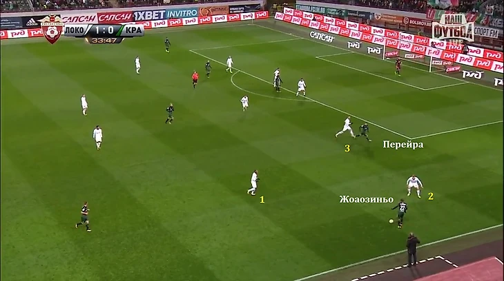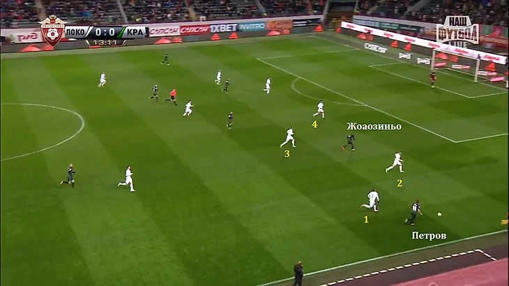 Затем идёт атака левым флангом и вновь нет численного преимущества. «Локомотив» перестроился.