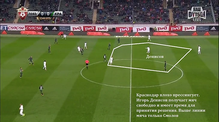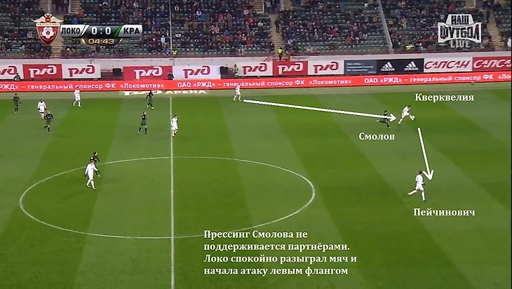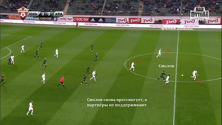 Ниже первый сигнал для Смолова, что команда не прессингует выше линии середины поля.