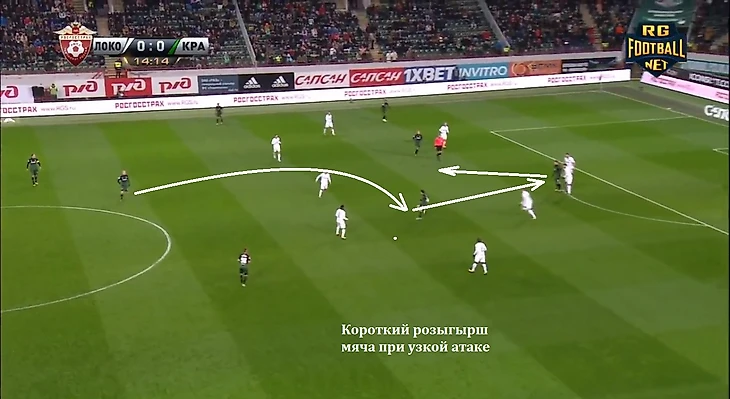 Для игры в короткий пас не следует играть уж слишком широко. Наоборот, узкие атаки предпочтительнее. Вместо 4-3-3, как это было с «Локомотивом», логичнее использовать 4-2-3-1, где вингеры играют узко, исполняя иногда роли инсайдов. Так при короткой игре, вы будете достигать численного равенства или преимущества в зонах атаки.