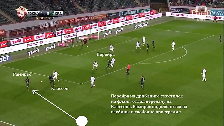 Одно из главных оружий «Краснодара» - это игроки, которые хороши в дриблинге. Перейра, Смолов, Классон и Вандерсон. В следующем моменте Перейра на дриблинге прошёл через центр, стянул на себя трёх игроков и отдал передачу на Классона. Тот, в свою очередь, заметил подключение Рамиреса и отдал мяч партнёру, который без помех прострелил в штрафную на всё того же Перейру. Акцентированным ударом момент не завершился – мелочи жизни.