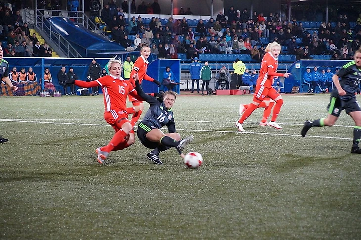 Второе, о чем я подумал, была поддержка сборной. Несмотря на то, что матч проходил не в столице, на матче присутствовало около двух тысяч зрителей, среди них, кстати, был Александр Кержаков. Зная, как поддерживают мужскую сборную, тут я ожидал одинокие выкрики «Россия» и не более того. И представьте мое удивление, когда я услышал организованные заряды вроде: «Опачки, апочки – наши девки лапочки», «Оп, оп, оп, оп, оп, Надя давай!» (По мотивам песни группы Хлеб – Эба), «Оп давай давай, оп давай давай, доминируй, унижай», как уже классический заряд для Петербурга, и многие другие. С поддержкой проблем не было.
