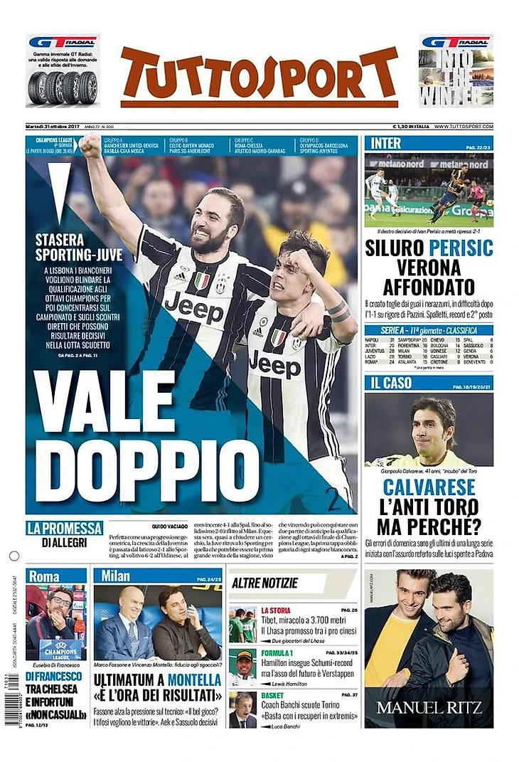 В Лиссабоне нужен Дибала на топ-уровне. Заряд Раджи, чтобы победить Конте. Этим вечером Аллегри хочет заработать выход в 1/8-финала. Ди Франческо – гипотетический шанс. И завтра в Неаполе Сарри против Гвардиолы, схватка стилей.