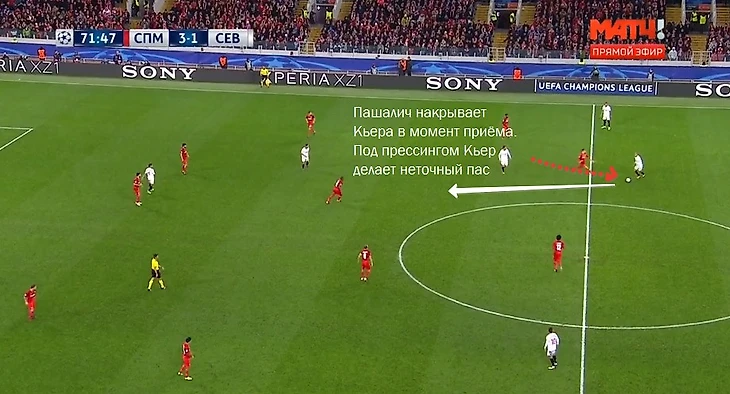 Лучшая работа Пашалича на поле – незаметная. Он выдвигался прессинговать на центральную линию в момент приёма передачи, заставляя как можно быстрее принимать решение (и чаще всего неудачное, игроки «Севильи» к тому моменту уже поплыли). Грамотно вступал в отбор, в том числе перед своей штрафной. При атаках, где испанцы ломали левый край «Спартака», опускался в линию защиты и страховал Комбарова. Да, это незаметная работа, но за счёт такой работы в «золотой» сезон имя себе сделал Роман Зобнин. И его интенсивных действий в центре поля «Спартаку» часто не хватало летом и ранней осенью.