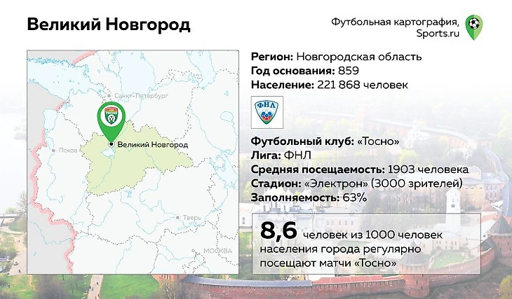 Во-вторых, мало кто знает об этом, кроме новгородцев, но именно наш город стал самым футбольным городом ФНЛ по итогам прошлого сезона. Не стоит забывать, что к Великому Новгороду «Тосно» не имеет никакого отношения. Просто люди очень любят футбол. Не верите, вот картография: