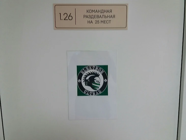 На дверь гостевой раздевалки сотрудники стадиона прикрепили эмблему фанатского движения «Электрона». Все, как на матчах ФНЛ. Мелочь, но приятно.