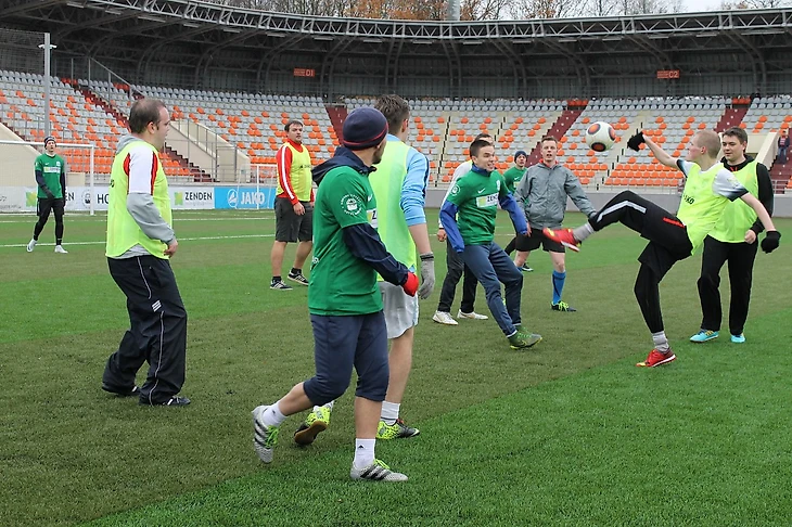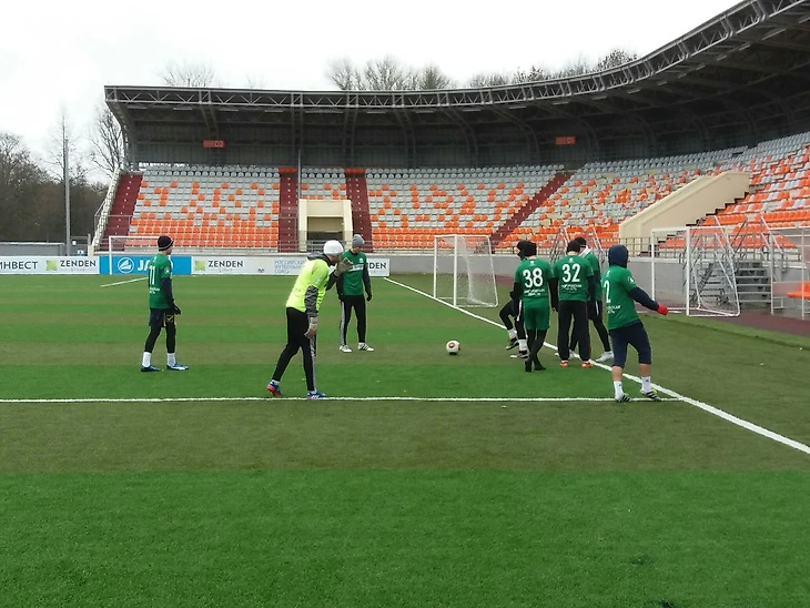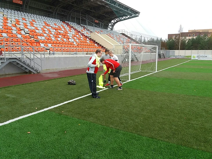Игроки «Электрона» вовсю готовятся к матчу. Здороваюсь с каждым, после чего направляюсь к команде болельщиков. Несмотря на товарищеский статус матча, получить травму на скользком синтетическом газоне очень легко. Поэтому особое внимание уделяю разминке. Пока партнёры по команде учатся обрабатывать мяч, я совершаю несколько кроссов вдоль центра поля и делаю растяжку. Затем вся команда отправляется в раздевалку для окончательной подготовки к матчу.