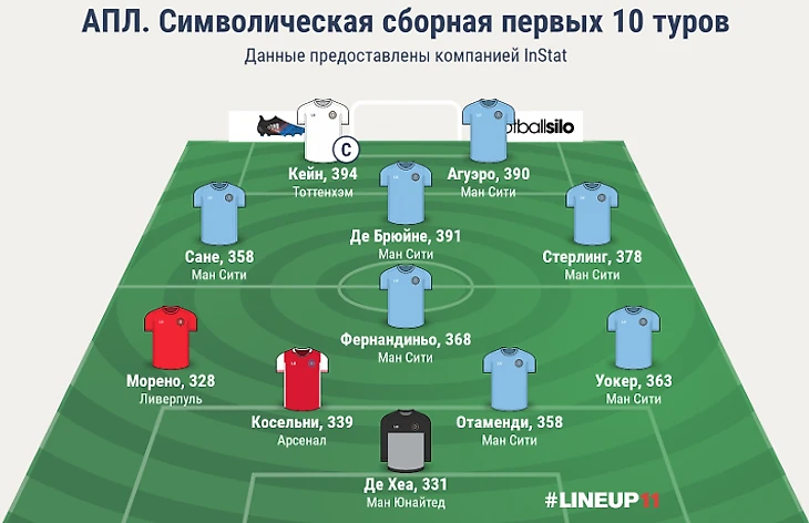 Лучшим клубом первых 10 туров стал "Манчестер Сити" со средним общекомандным рейтингом InStat Index, равным 348 баллам. Худшая команда - "Вест Бромвич Альбион" с 268 баллами.