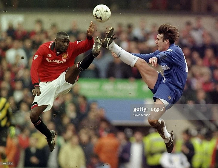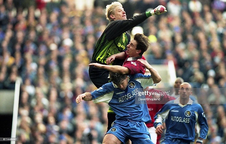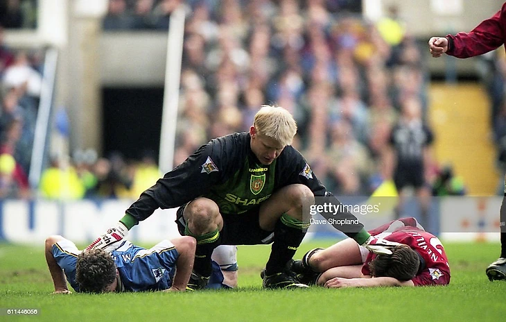 Что делает Петер? Он пытается привести в чувство Марка Хьюза и Гари Невилла, которые попали под "замес" его могучего выноса мяча из штрафной: