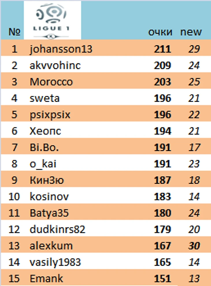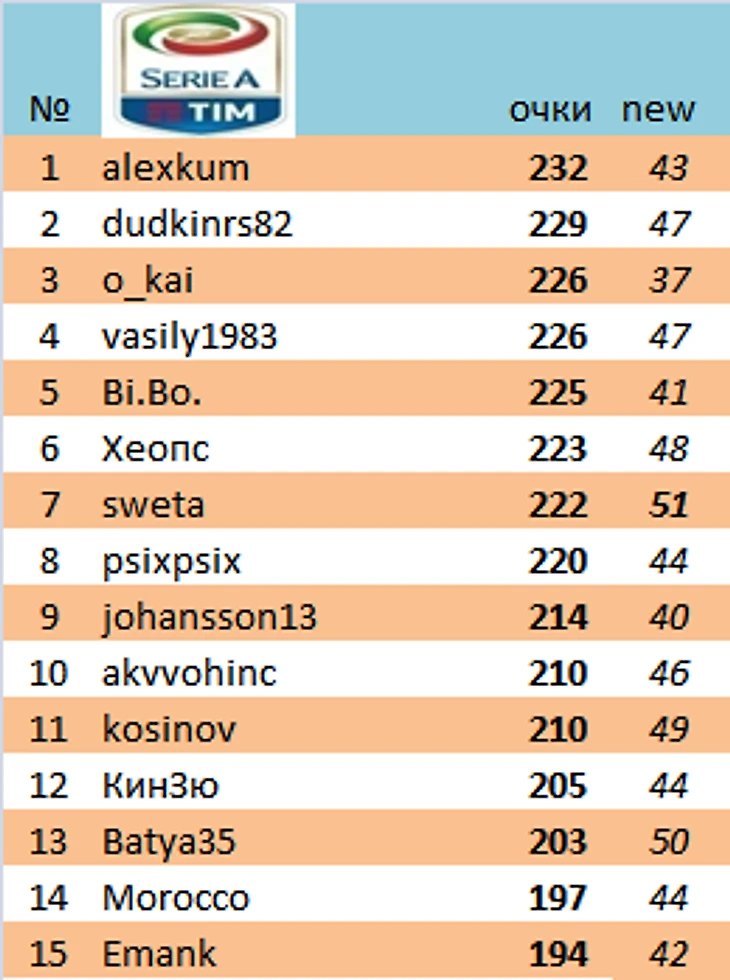 В Италии лучшей на отрезке в 2 тура была sweta  (51 очко)