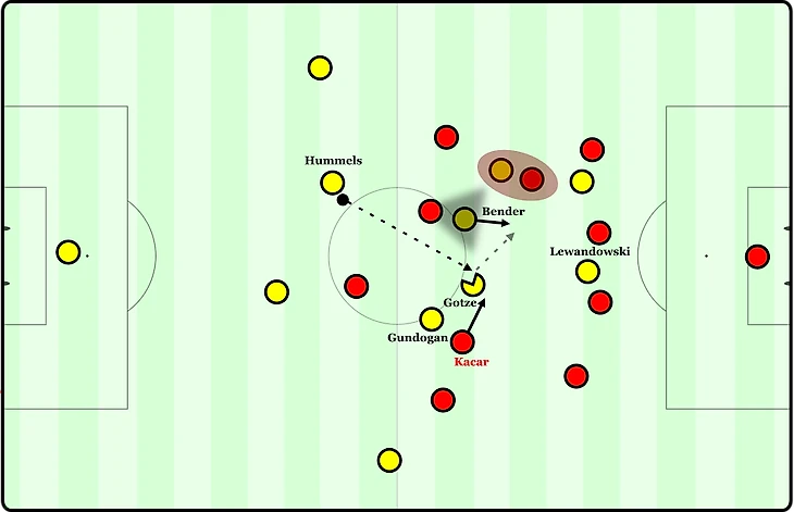 Здесь Бендер не доступен для передачи, но он будет открыт, как только Гётце примет мяч. Поворот Марио в сторону Бендера сигнализирует Качару о том, куда пойдёт следующая передача, и он начинает движение. Но Гётце поворачивается в другую сторону и беспрепятственно пасует Гюндогану. Качар попытается закрыть Илькая, но ситуация 2 в 1 слишком сложна для этого. Гётце снова получает мяч, мастерски обыгрывается с Левандовски, и забивает.