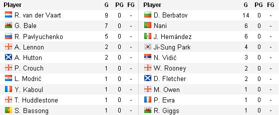 У «Манчестер Юнайтед» хороший подбор игроков. И поэтому для «Тоттенхэма» опасность будут выражать сразу несколько игроков. Во-первых, это Нани, который великолепно играет в этом сезоне и частенько пополняет свой КПД. Во-вторых, это Бербатов, который является лучшим бомбардиром АПЛ (14 мячей). Стоит отметить Райана Гиггза и Уэйна Руни, который постоянно создают опасность у ворот соперника. К этим опасным игрокам можно отнести и Андерсона, когда бразилец в хорошей форме, но видимо не в этот раз.