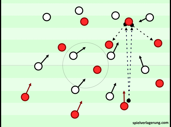 Для успешного вертикального билдапа нужна хорошая структура поддержки. Особенно в том случае, когда соперник использует зональную опеку. Из-за длинных вертикальных передач низом соперник должен закрывать как можно больше зон, чтобы обезопасить свои ворота. И очень сложно сочетать высокий прессинг с хорошим заполнением пространства в глубоких зонах. Если соперник пытается сыграть с высокой линией обороны, чтобы сохранить компактность при высоком прессинге, то остаётся пространство позади защитников.