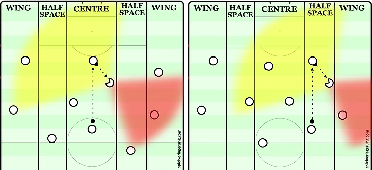 Тот же принцип применяется в ситуации, когда игрок получает мяч после вертикальной передачи, но не передаёт снаряд другому, а разворачивается к воротам соперника сам. Он улучшает своё поле зрения. Если получить мяч в центре, то после разворота за спиной окажется слишком много пространства, из которого может атаковать футболист в майке другого цвете. Если получить мяч в полупространстве или даже на фланге, то за спиной останется лишь небольшой кусочек этого самого фланга, и почти все соперники будут впереди.