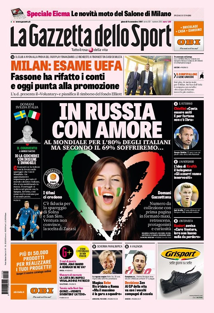 На Мундиаль для 80% итальянцев, но вторые 69% страдают… Болельщики уверены: есть вера в стыковые матчи в Сольне и на «Сан Сиро». Вентура не убеждает, выбран Дзадза. Завтра специальный коллекционный номер Gazzetta в макси-формате, с подробностями, главными героями и курьёзами.