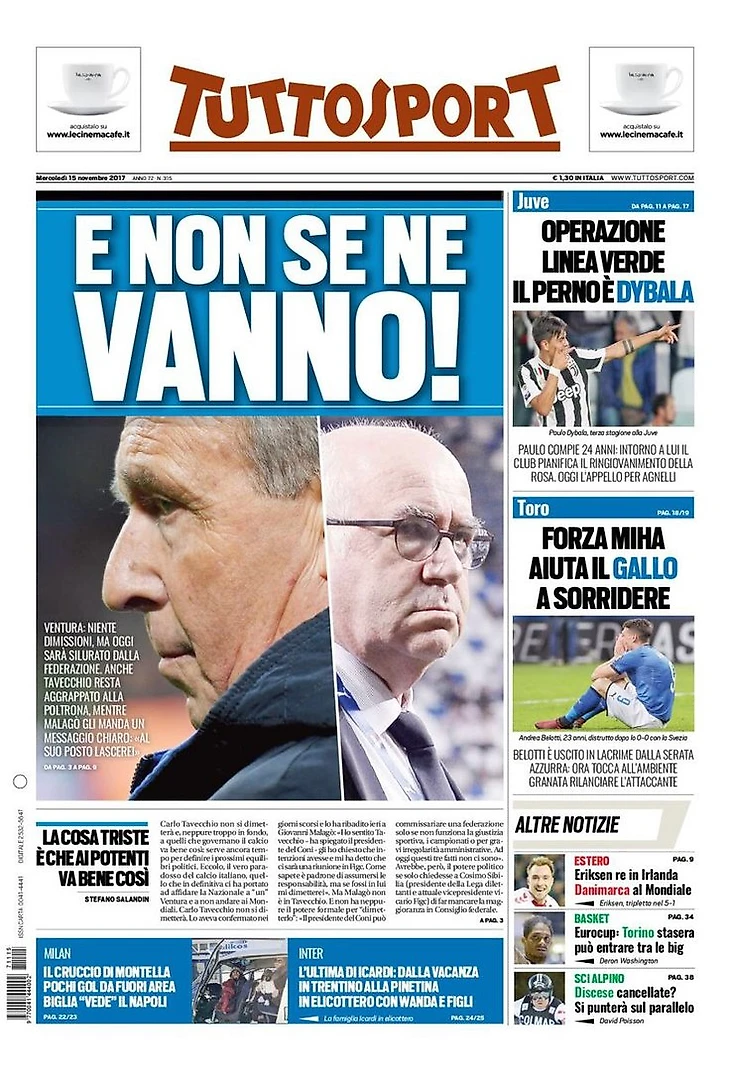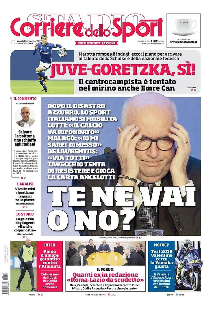 Манифест Gazzetta. Италия: вот 10 идей для того, чтобы подняться. Сборная: попытка Анчелотти, но требуется обновление. Малаго снимает Тавеккьо (который пробует сопротивляться). Многие допускают также на Gazzetta.it Карло в качестве главного тренера (90000 проголосовавших). В борьбе также Конте, Манчини и Раньери. Вентура не уходит в отставку: дело за властью. Мечты сломаны поколением игроков и молодых болельщиков. Между тем молодёжная сборная победила Россию…