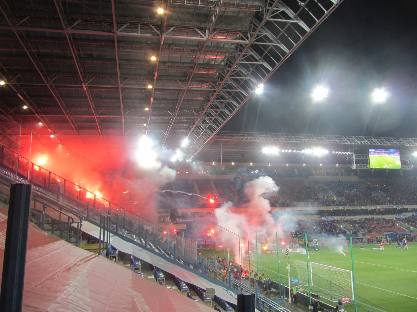 Моё место оказались недалеко от углового флажка: напротив вираж ультрас «Вислы», а по соседству, через ряд ограждений и пустых секторов – фанаты гостей. Публика на секторе выглядела не очень разнообразной: редкие семейные парочки или молодежь, но в основном – мужики лет сорок-пятьдесят, простые работяги. Многих из них можно было назвать «фанатами в отставке»: они обзавелись семьями и остепенились, но по-прежнему знали все фанатские песни и горланили их со всей сердечностью. В отличие от центральной трибуны, наш сектор смотрел матч стоя.