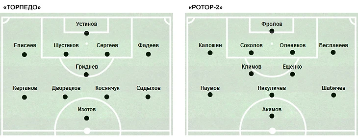 «Ротор-2» (футболки – синие): №77 Фролов, №3 Олеников - к, №17 Соколов, №8 Калошин, №22 Шабичев (№96 Даурский, 59), №23 Бесланеев, №14 Никуличев (№11 Зотьев, 62), №94 Наумов (№19 Тазетдинов, 86), №24 Ещенко, №95 Климов, №9 Акимов. Запасные: №16 Бунин, №18 Попов. Главный тренер – Дмитрий Петренко.