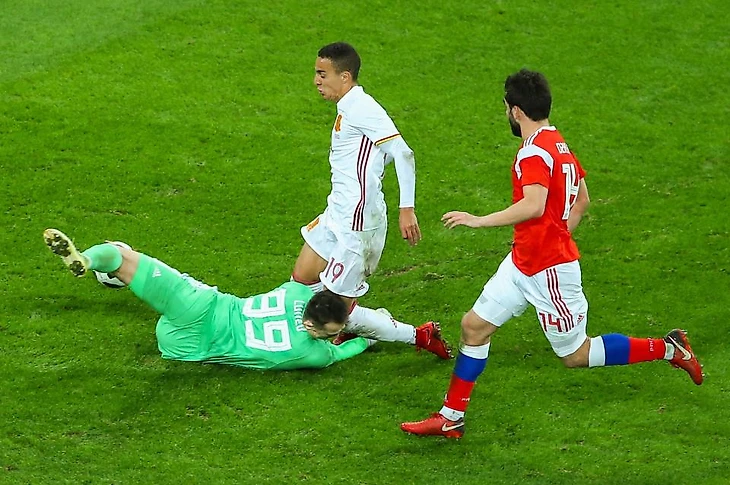 А теперь отмотаем пленку немного назад. Счет 2-3. Родриго получает мяч все на той же линии офсайда и... правильно! Плохо его обрабатывает - первое касание оказалось слишком сильным. Но так как расстояние в тот раз до Лунева было бОльшим, то испанец успел добежать до мяча и ударить. Кипер сборной России к тому моменту уже вышел из ворот и сократил дистанцию.