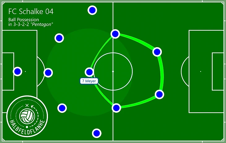 Таким образом, эти пять игроков – оборонительный и атакующий полузащитники и нападающие – образуют пятиугольник. И бо́льшую часть игры он остается стабильным. Преимущество в том, что каждый фланг, традиционно слабое звено при игре с тремя центрбеками, покрывается. И более того, это фундаментальная часть в комбинациях. С Майером, выдернутым назад, на флангах есть по 4 игрока. Без потери большого количества времени или постановки стабильности системы под угрозу.