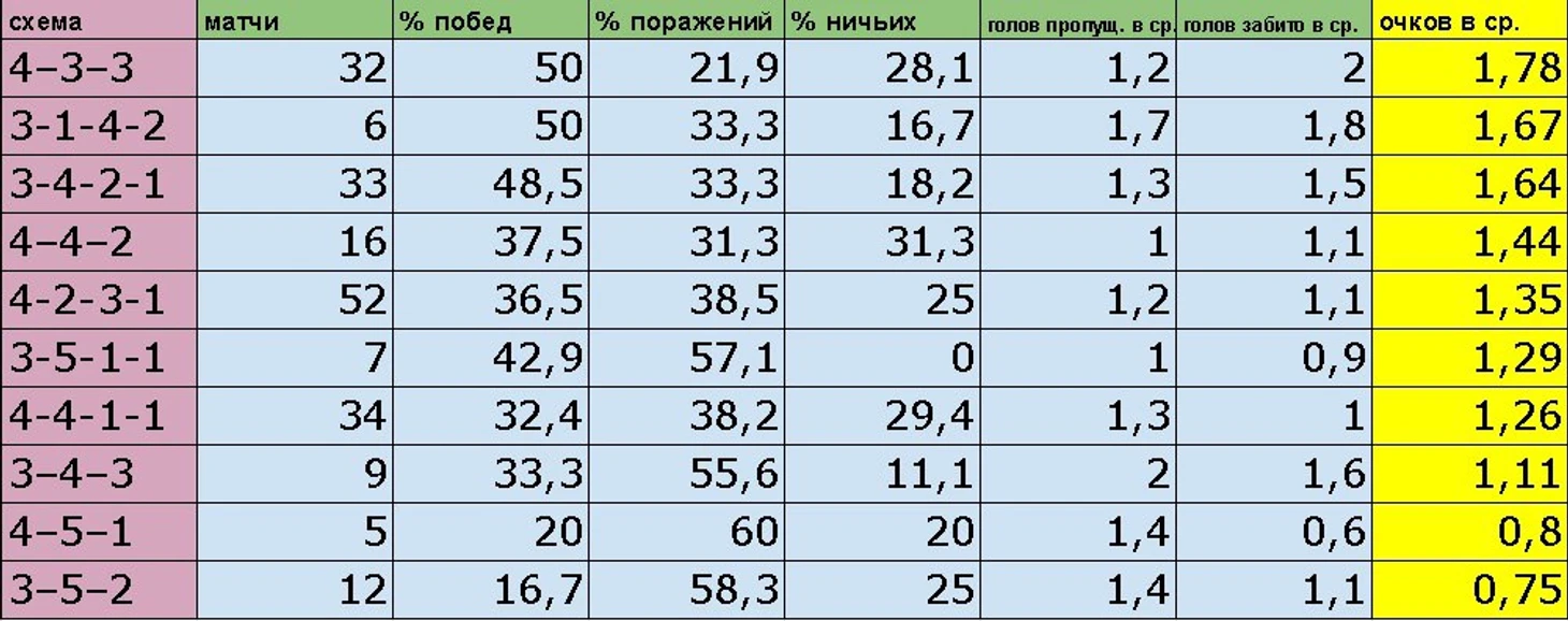 Эффективность и статистику каждой расстановки достаточно сложно подсчитать, потому что её попросту тяжело определить. Однако сделать это всё–таки можно, и понять, что самой эффективной схемой этого сезона является 4–3–3. Коучи, выбирающие именно эту расстановку, выигрывают половину своих матчей и набирают в среднем по 1,78 очка за матч. Львиную долю побед сюда привнёс Пеп Гвардиола и с отрывом самая успешная команда Премьер–Лиги старта сезона.