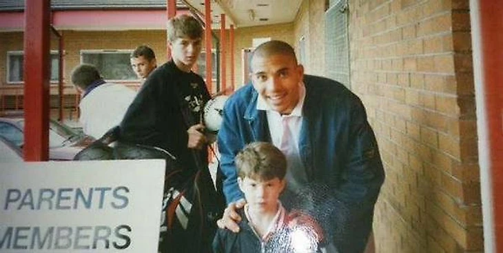 Игрок «Ливерпуля» Стэн Коллимор с фанатом. На заднем плане можно увидеть юного Стивена Джеррарда, 1996.