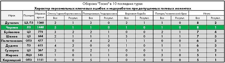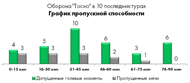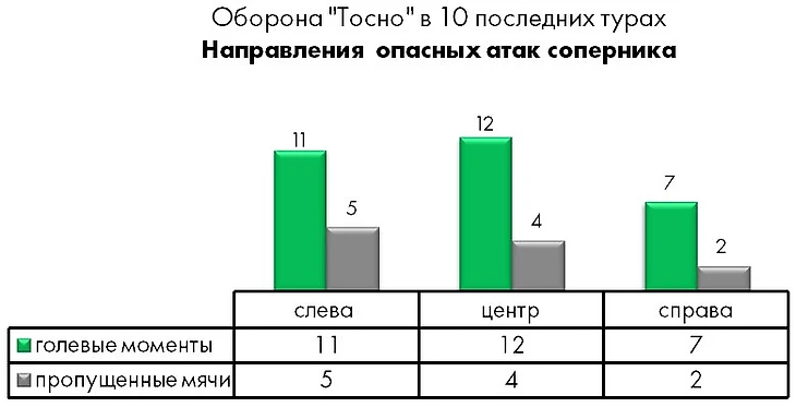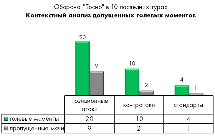 Но одних лишь математических законов для победы недостаточно, и без детального изучения сильных и слабых сторон соперника, в любом случае, не обойтись. Как показал контекстный анализ допущенных голевых моментов у ворот команды Парфенова в 10 последних турах, оборона «Тосно» отнюдь не безгрешна, но достаточно дисциплинирована для того, чтобы избегать откровенно провальных матчей.