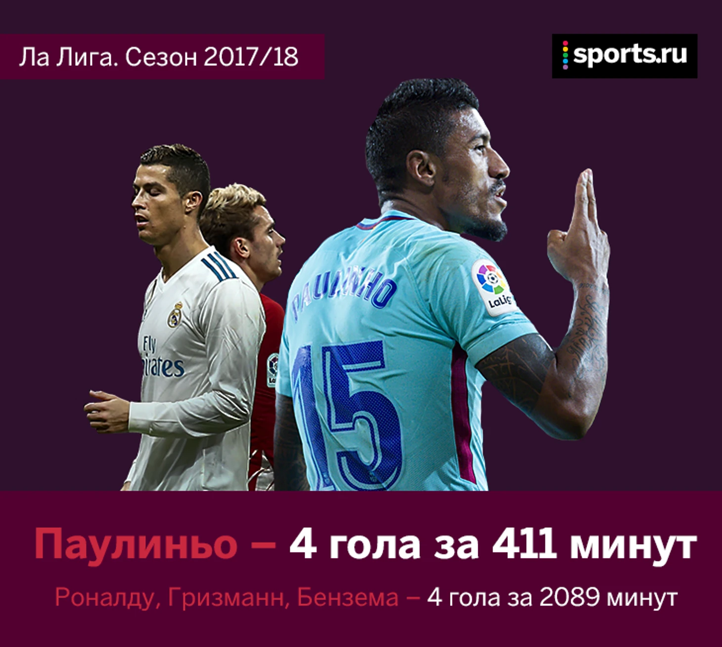 Столько претензий еще до первого матча в новом клубе. Такое могло бы сломать любого – но не Паулиньо. 16 сентября он вышел на замену в игре с «Хетафе» и забил первый гол за «Барсу». Второй он забил уже в следующем матче – в ворота «Эйбара». Сейчас у него 4 мяча в примере – у Криштиану, Бэйла и Бензема столько же на троих. Чтобы забить четыре, бразильцу понадобилось 411 минут.
