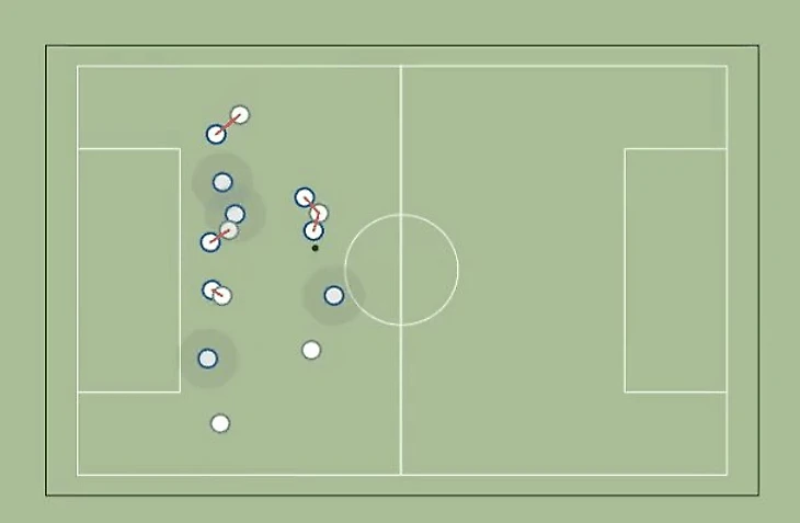 Таварес в том же материале предложил и моделирование опеки. Если игрок атакующей команды находится в определенном радиусе от защитника, то он находится под персональной опекой. Если же вблизи обороняющегося игрока нет атакующих, то считается, что он закрывает некоторую зону. В оценку игры защитника можно будет ввести дополнительный параметр, например, показывающий, как часто соперники избавляются от его опеки. Также реально оценивать степень плотности опеки команды в обороне как среднее по всем защитникам расстояние до ближайшего соперника.
