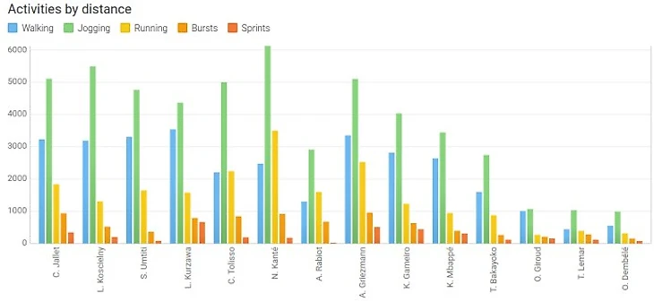 Фитнесом называются данные о беговой работе. Пусть не так массово, но эти данные собираются уже сейчас. После того, как все координаты игроков получены, считается пробег в пяти диапазонах скоростей - от пешеходной до спринтерской. Также находится количество ускорений и спринтов для каждого игрока. В будущем можно было бы выводить интегральную метрику физической готовности игрока на основании в первую очередь пробега на высокой скорости. Интересно взглянуть и на график готовности конкретного игрока от матча к матчу. Да, пробег в конкретной игре зависит от позиции, роли, стиля игры своей команды и соперника, но во-первых, можно делать поправки, а во-вторых, общий тренд роста или снижения физической формы все равно должен быть заметен.