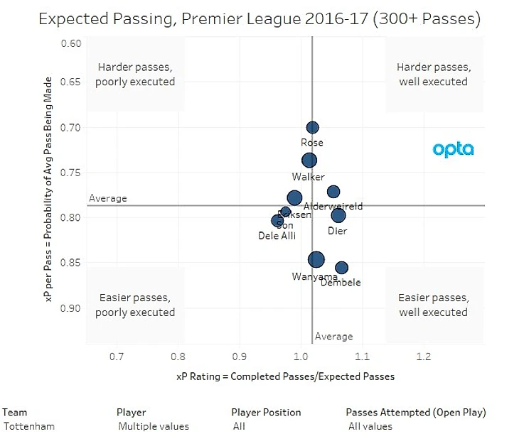 Оценивать полезность паса для команды можно по двум параметрам - вероятности дойти до адресата (зависит от техники игрока) и пользы передачи для развития атаки при условии успешного перевода (мышление). Средний процент точности передач сам по себе бесполезен, так как не учитывает роль игрока, его позицию на поле и прочие факторы. Но если у нас есть данные о положении игроков, находящихся в области между дающим и получающим в момент совершения паса, с помощью методов машинного обучения можно построить модель, которая бы оценивала вероятность конкретной передачи дойти до адресата для гипотетических средних дающего и принимающего. Измерив на большой выборке превышение реальной точности передач над ожидаемой, можно определить, насколько хорошо игрок может отдавать передачи вне контекста того, насколько его пасы полезны.