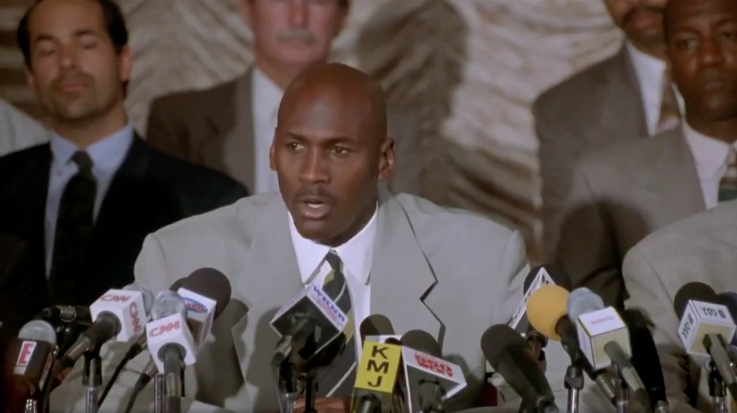 4) Пресс-конференция Майкла в самом начале фильма. Лучший худший момент? Сумасшедшее по масштабу заявление Джордана об уходе из баскетбола в бейсбол, после чего один из репортеров спрашивает, на какой позиции он будет играть. Само собой, это первый вопрос, который приходит в голову, когда ЛУЧШИЙ СПОРТСМЕН В ИСТОРИИ СЕНСАЦИОННО УХОДИТ ИЗ НБА НА ПИКЕ КАРЬЕРЫ, ЧТОБЫ ПОПРОБОВАТЬ СЕБЯ В ГРЕБАНОМ БЕЙСБОЛЕ!