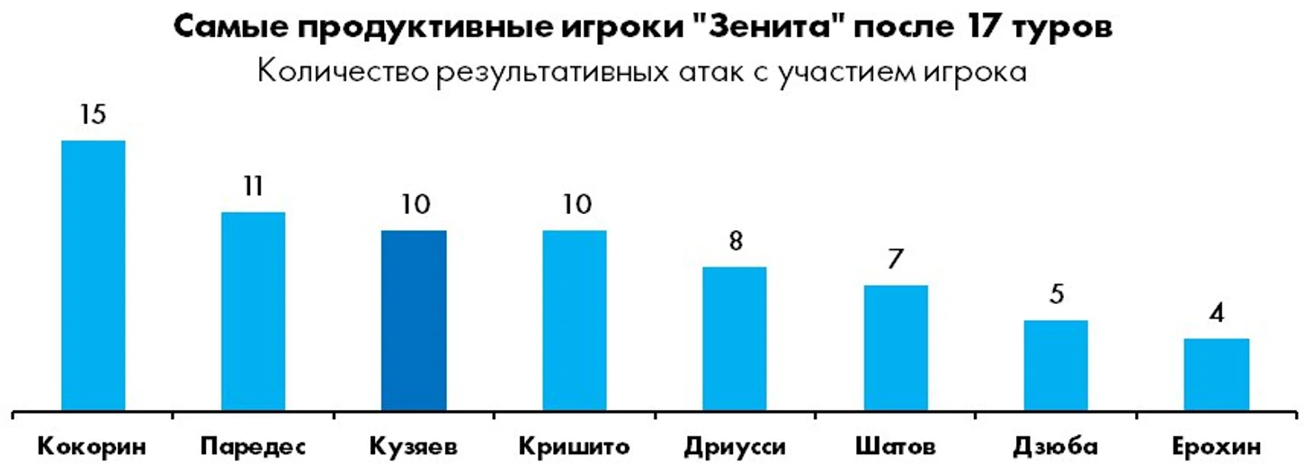 Возвращаясь к событиям северного дерби, самым активным у «Зенита» в созидательном плане оказался Кузяев (4 полезных действия/ 3 голевых соучастия), отлично отыгравший и против сборной Испании в середине недели. Кто бы мог подумать, что к середине сезона Далер окажется в тройке самых продуктивных игроков «Зенита» в чемпионате.