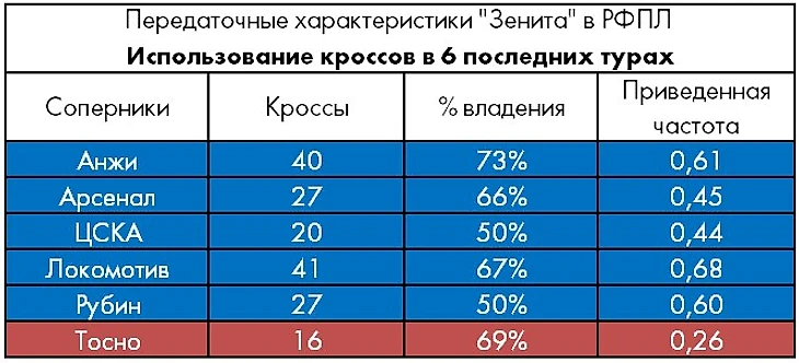 В матче с «Тосно» сине-бело-голубые по максимуму использовали слабости соперника, оказывая повышенное давление на крайних защитников (для обоих – и Галиулина, и Сухарева – эта позиция не является профильной), но при этом не злоупотребляя фланговыми забросами в штрафную. Так называемая «кроссовая частота» (количество кроссов, отнесенное к времени владения) оказалась примерно вдвое ниже обычных значений (средний показатель по сезону в целом составляет 0,46).
