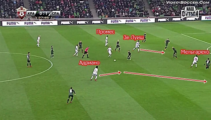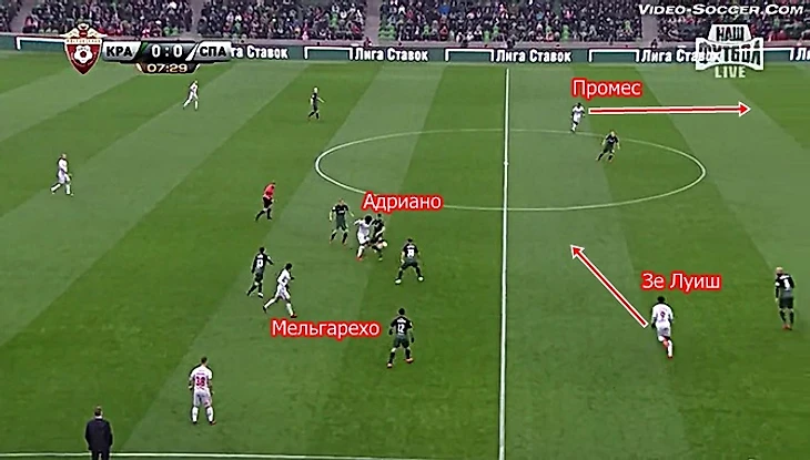 И снова бразилец играет почти на одной линии с Фернандо и Глушаковым - Мельгарехо условный правый полузащитник располагается на одной линии с защитниками Краснодара, Промес открывается на любимом левом фланге, но бразилец сам тащит мяч на фланг, выцеливая партнеров и выдает грамотную неожиданную передачу на Зе Луиша.