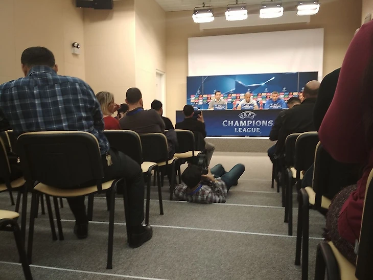 Фотограф, пытавшийся поймать удачный кадр на пресс-конференции главного тренера "Карабаха" перед матчем с "Челси", сам невольно стал героем другого удачного кадра.