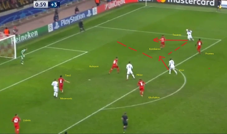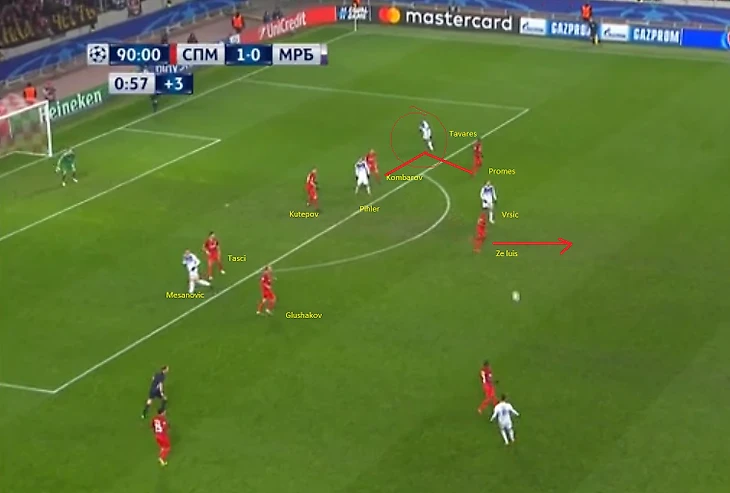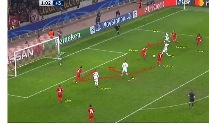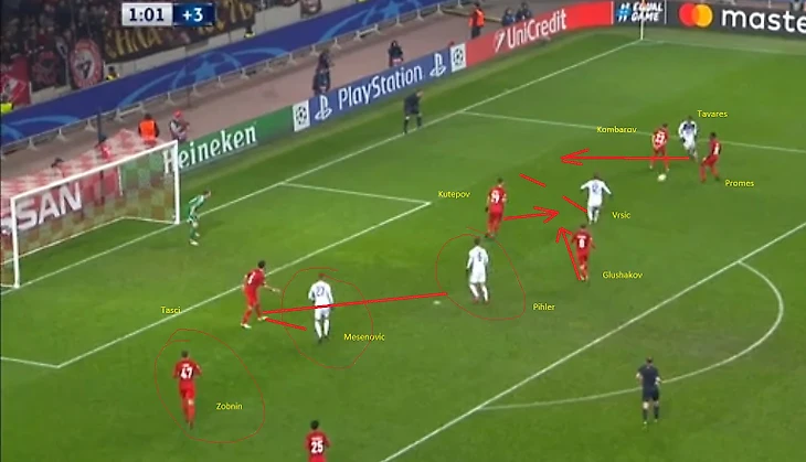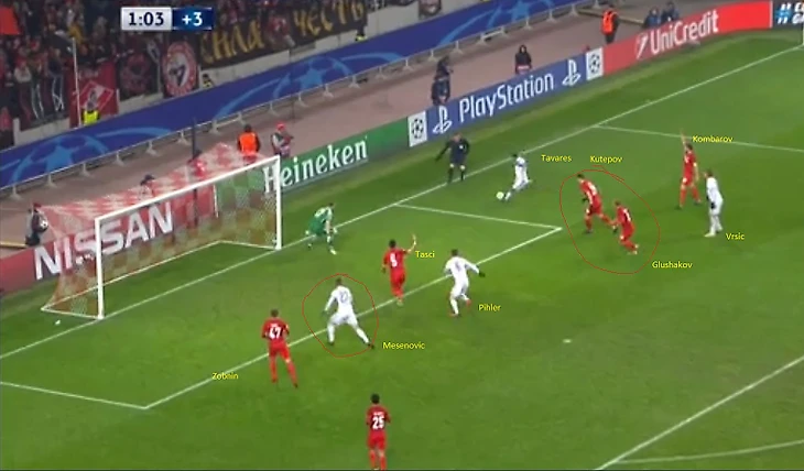 Далее Кутепов выдвигается на свободного Vrsic, но в результате этого открытым остается Pihler, которого должен был контролировать Глушаков, но Денис пошел за Vrscic и теперь Таски должен контролировать двоих, в то время как Комбаров и Промес держат Тavares, Глушаков и Кутепов Vrscic, а Зобнин не держит никого. Ошибка Глушакова и Зобнина.