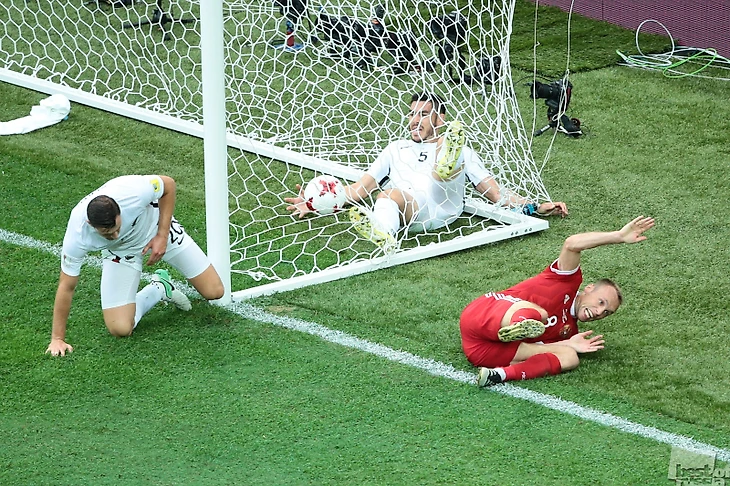 В числе прочих представлена фотография полузащитника сборной России Дениса Глушакова, отмечающего забитый мяч в ворота сборной Новой Зеландии в стартовом матче Кубка конфедераций.