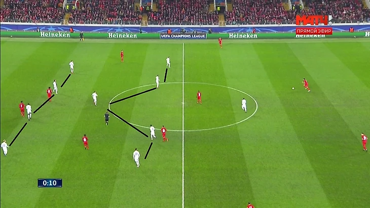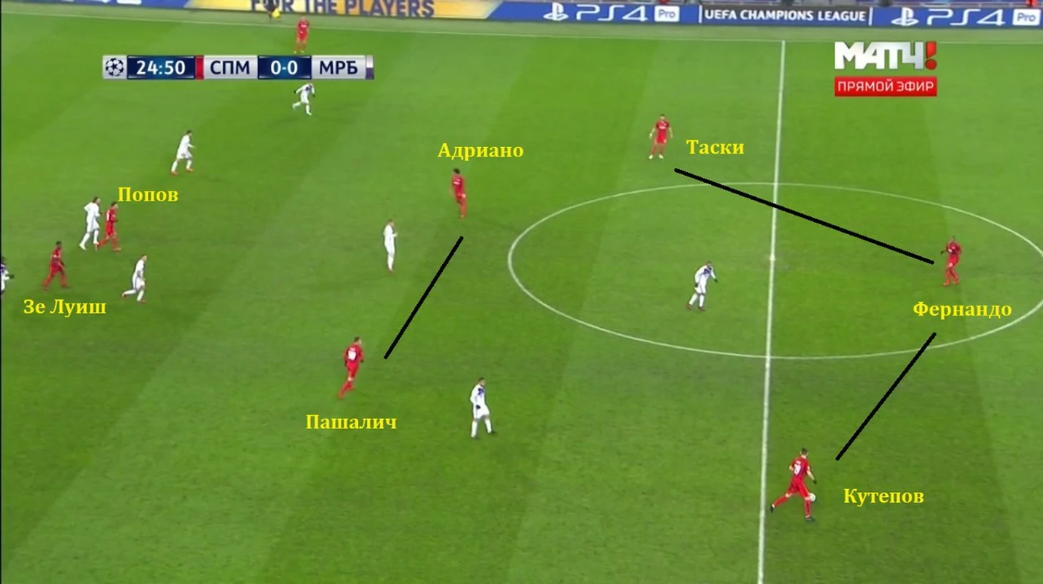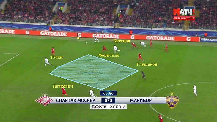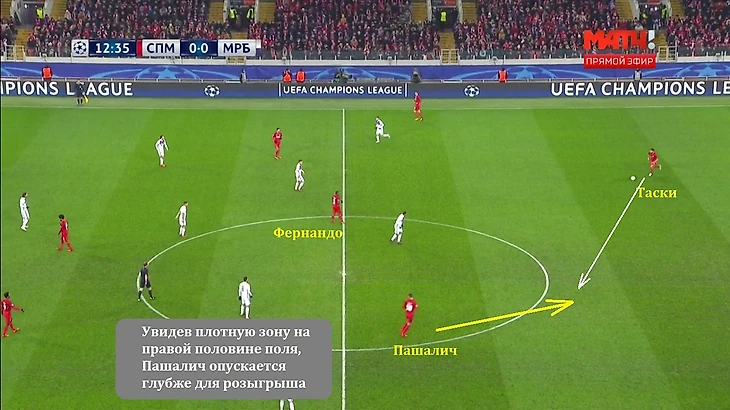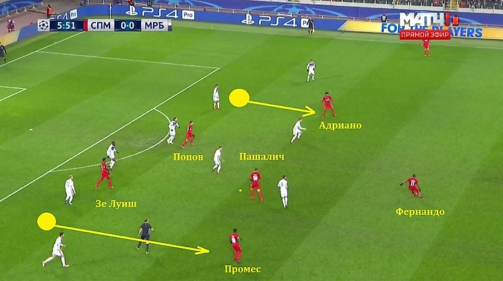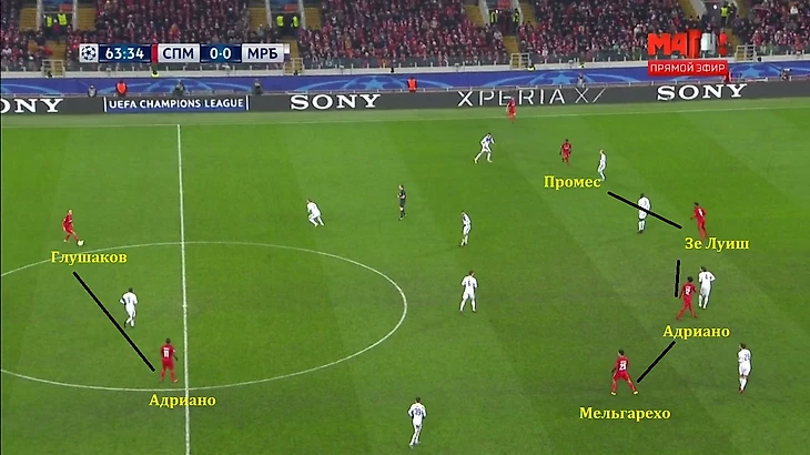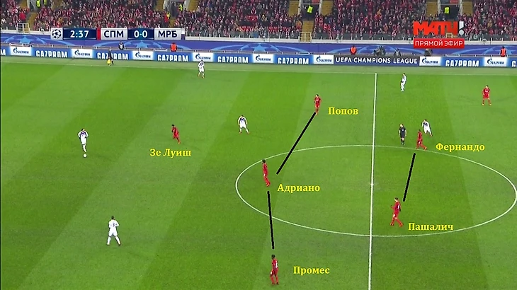 Если же «Марибор» закрывал возможность перейти на свою половину и активно прессинговал, «Спартак» перестраивался на три центральных защитника, где роль самого центрального исполнял или Кутепов, или Фернандо.