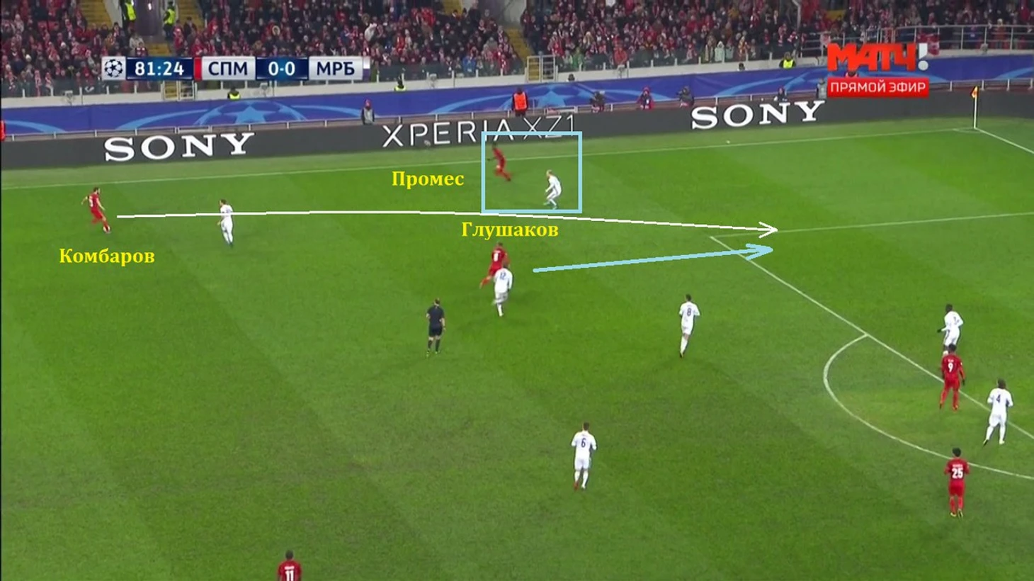 Промес утащил за собой крайнего защитника и Денис смог получить мяч на свободном пространстве. Отмечу и Комбарова, который прекрасно увидел эпизод.